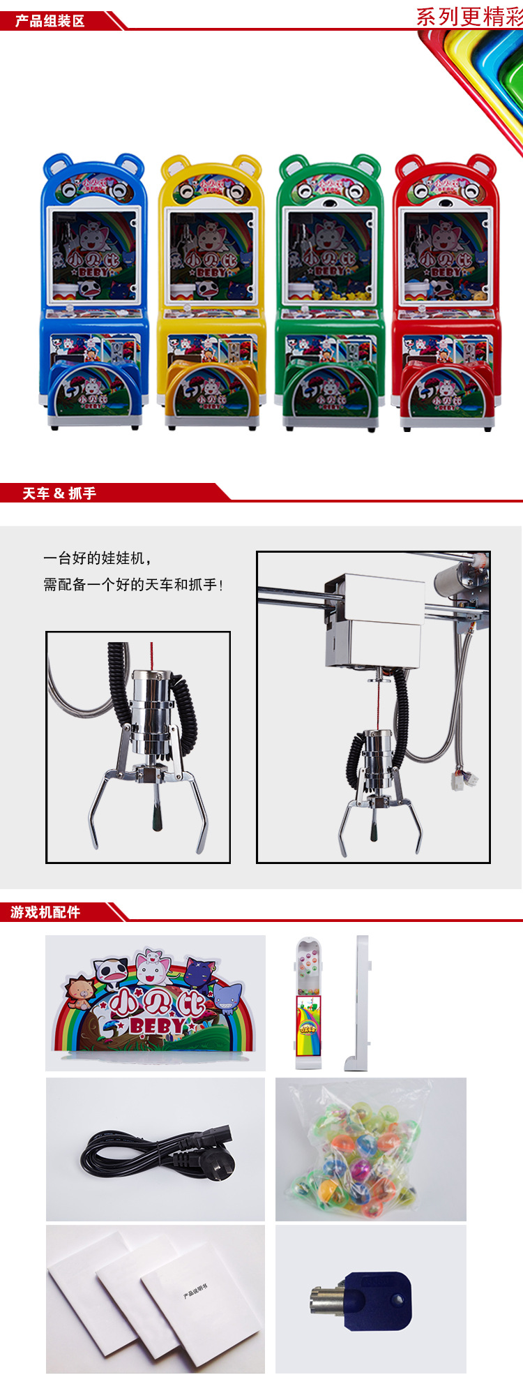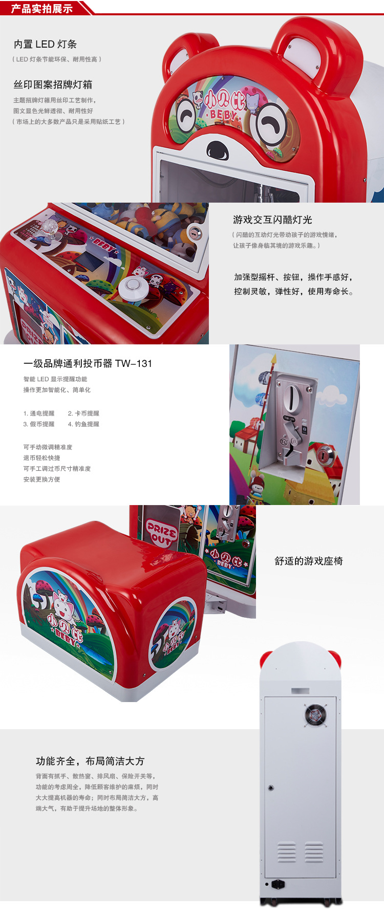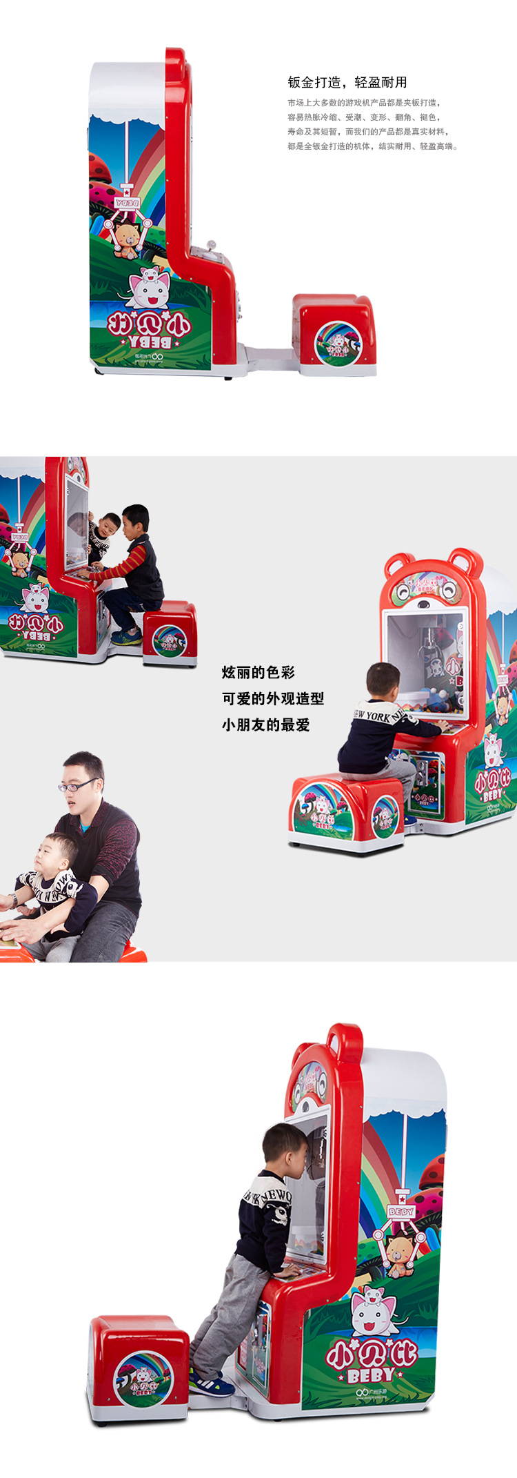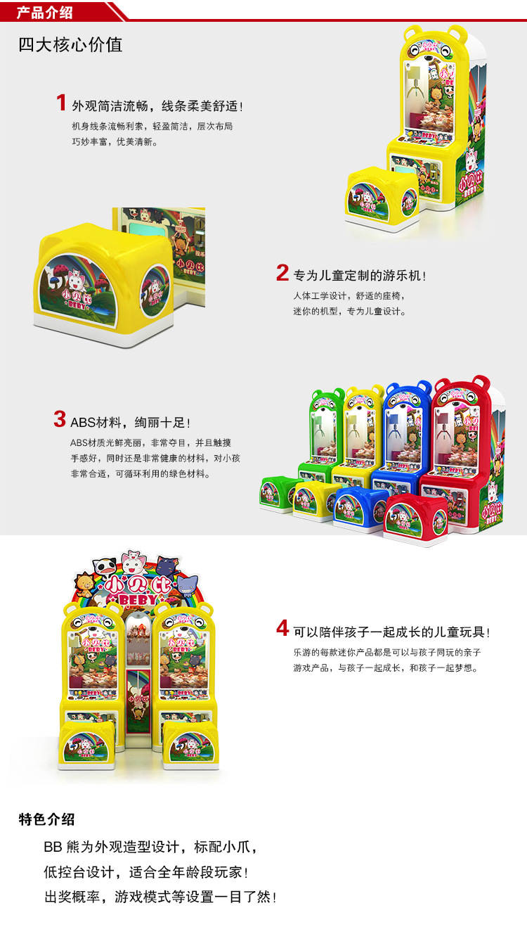 这是一款专门为2-12岁小朋友设计的娃娃机,整个设计大胆创新,打破传统的娃娃机单一、呆板、冷峻的方盒子造型,设计出可爱、亲切、时尚的外观形象,赋予了产品生命力和时代感!